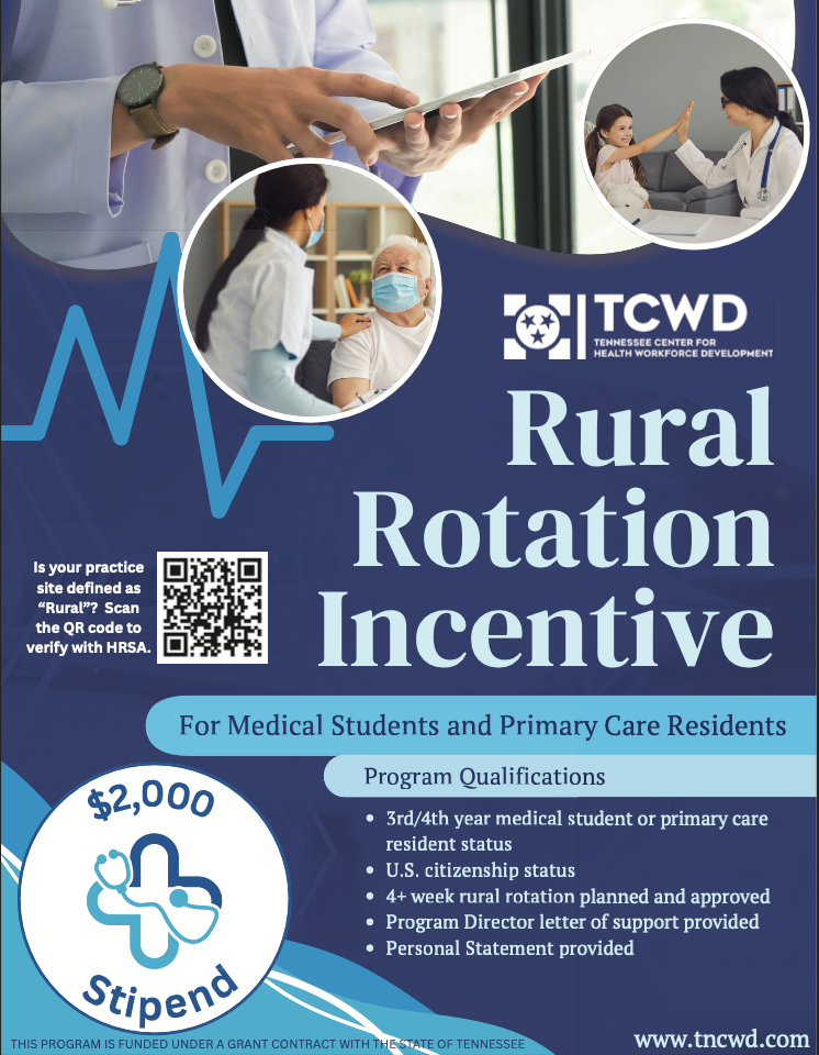 TCWD Rural Rotation Incentive Program is only available for rotations happening in Tennessee. Funds for this incentive program are to be used for expenses during the rotation (i.e. travel, lodging, food, etc.). Stipends are sent directly to the recipients. Recipients of this award will need to complete a 2-page synopsis after completing the rotation outlining their experience.