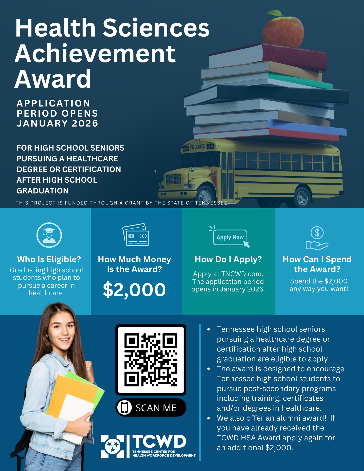 Eligibility: Individuals who received the TCWD Health Sciences Achievement Award (previously known as the MLVC Award) are welcome to apply for the alumni award! Awards will be given in the amount of $2,000 and there are no requirements as to how the money must be spent. Alumni awards are only offered the year after a recipient received their initial Health Sciences Achievement Award. This award has been established to encourage Tennessee students to pursue post-secondary programs (training, certificates, or degrees) to set them on a path for a career in healthcare.
